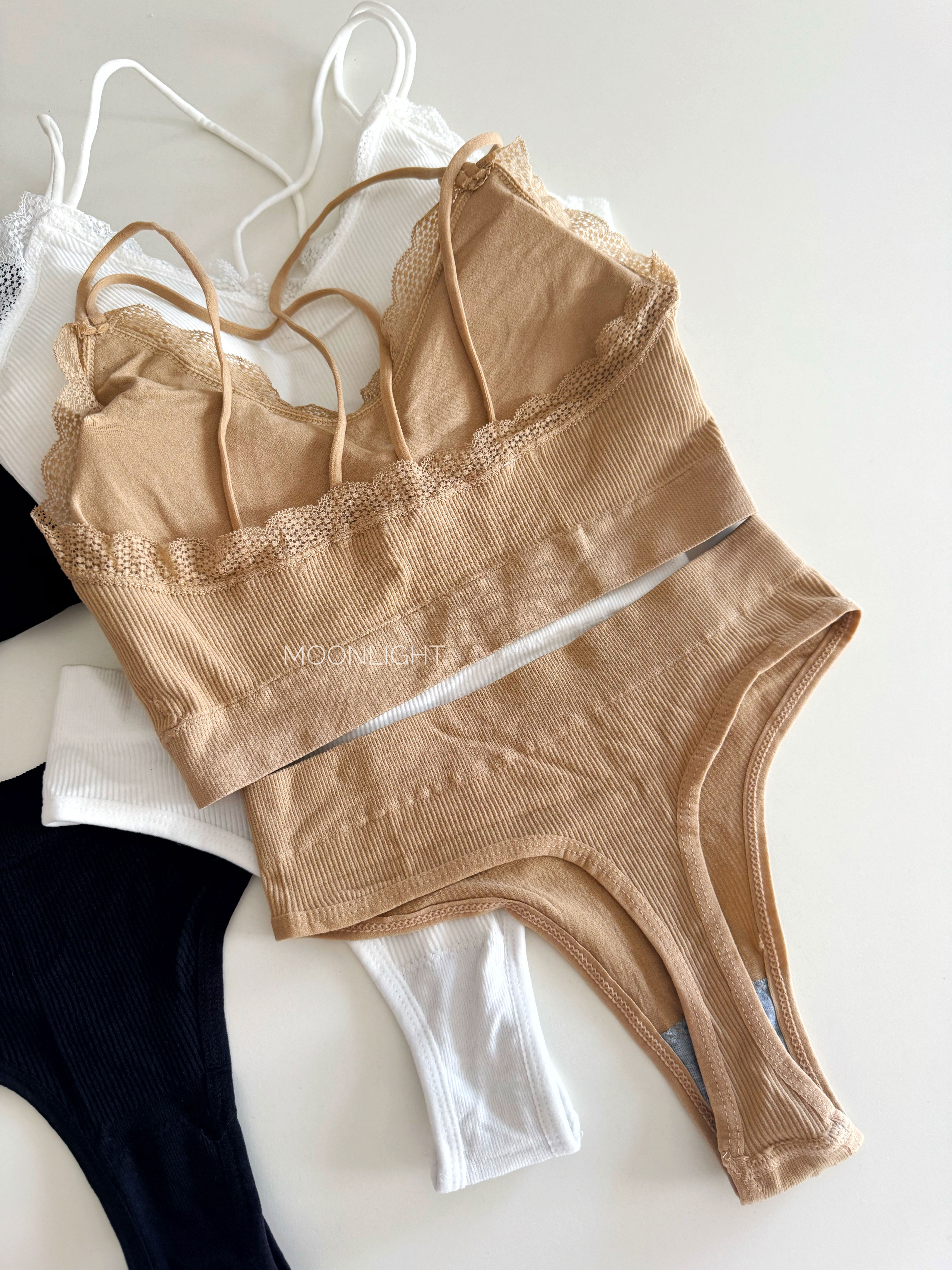El corpiño tiene detalle de puntilla en el escote, breteles finos que realzan la forma natural, y tazas desmontables mientras que la colaless tiro alto combina perfectamente para un look simple y encantador.