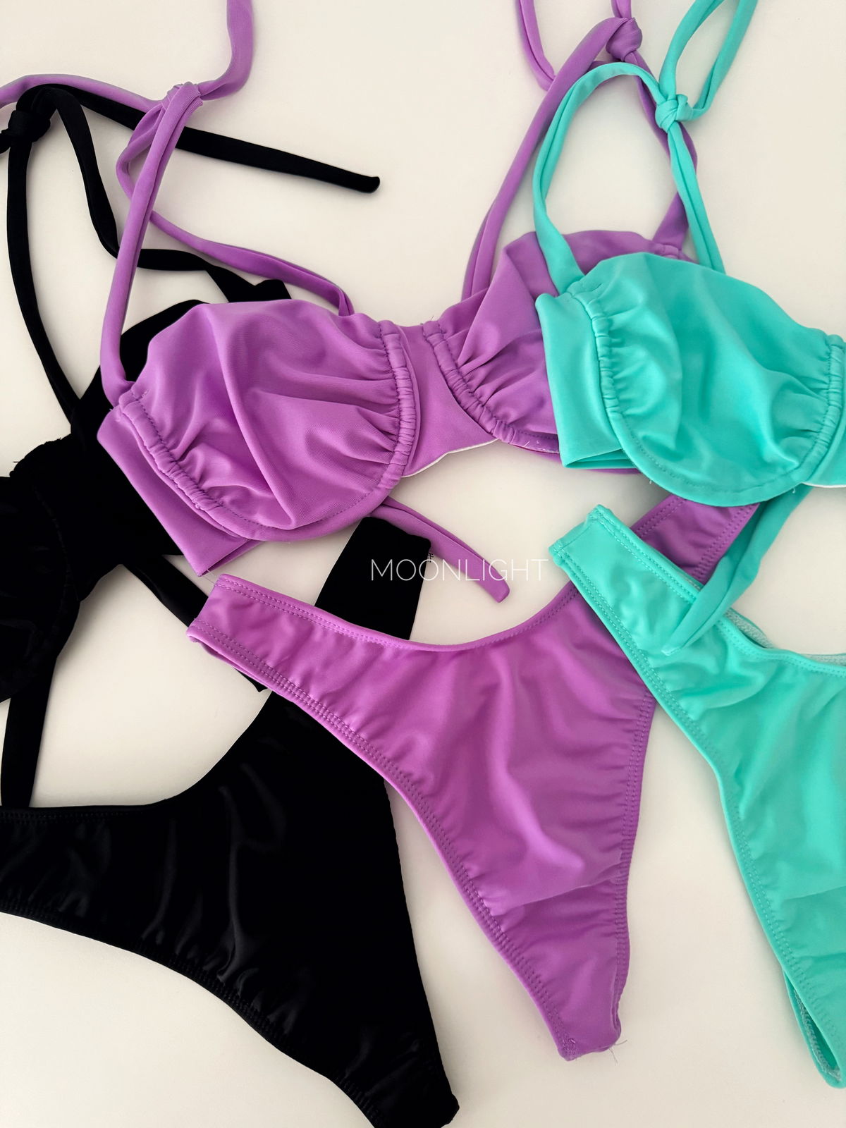 Bikini con aro que realza y sostiene, con frunces en el centro para un calce favorecedor. Los breteles con moños permiten regular el ajuste a gusto. Totalmente forrado para mayor comodidad y sujeción. La colaless en V estiliza la figura y se adapta perfecto al cuerpo.
